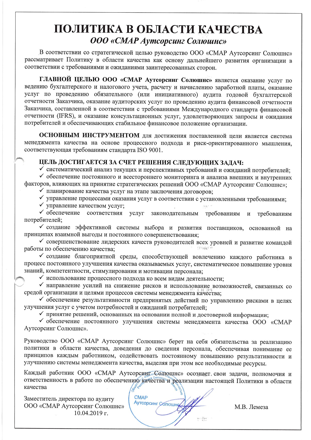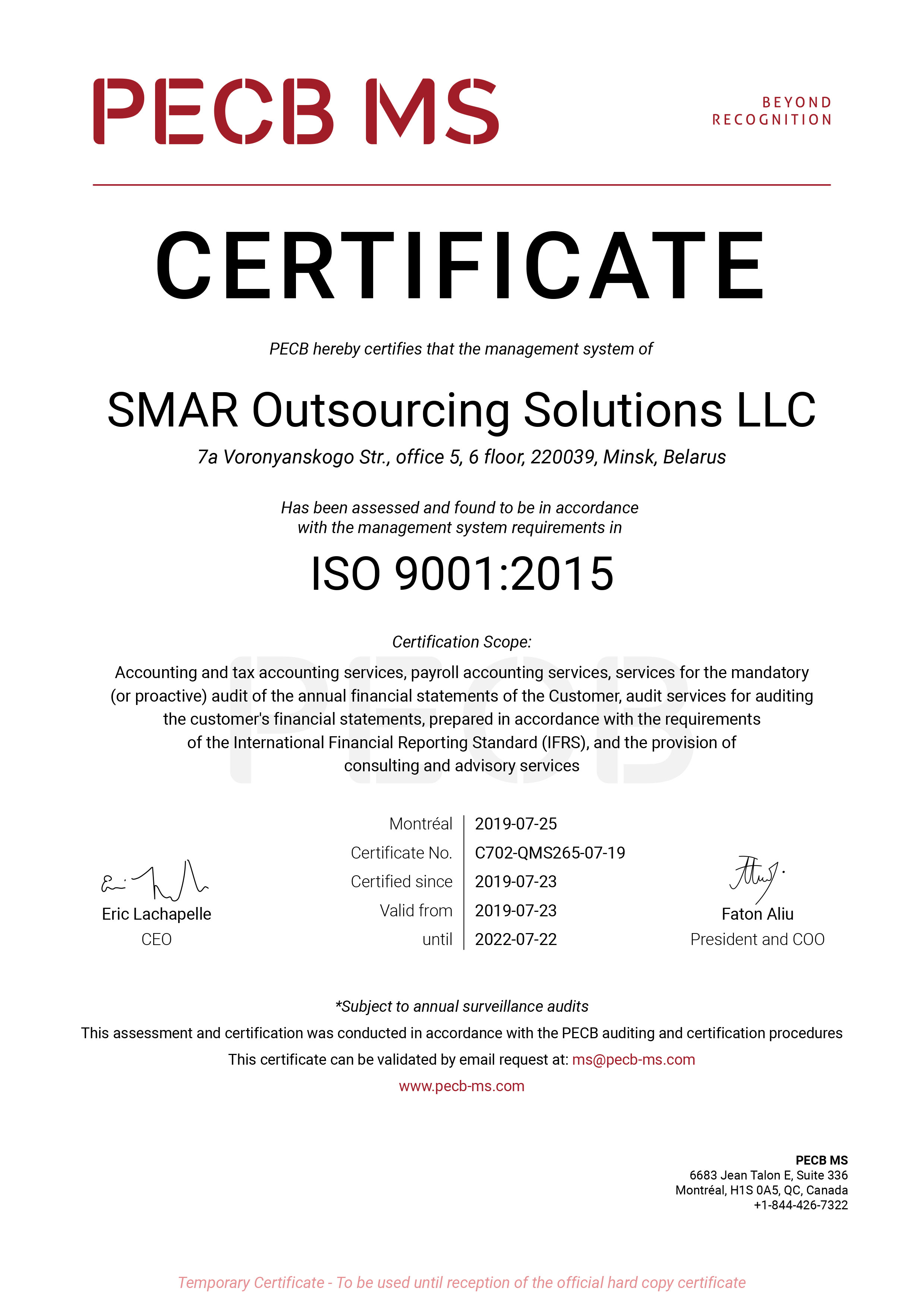 В 2019 году компания SMAR Outsourcing Solutions получила сертификат по стандарту системы менеджмента качества ISO 9001 от PECB.